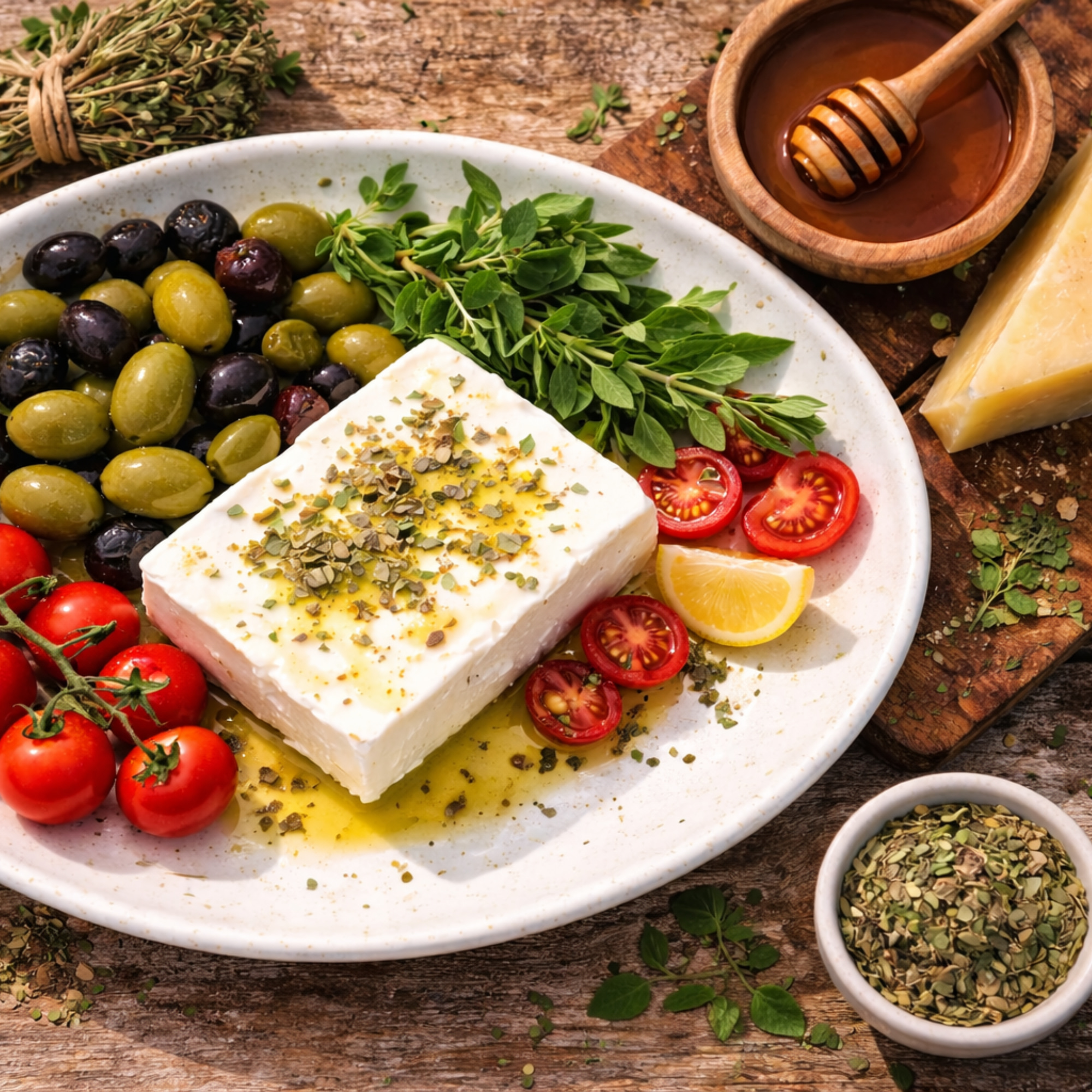 Řecký med je aromatický a hustý, často z tymiánu nebo horských květů. Bylinky jako oregano, tymián nebo rozmarýn rostou volně v přírodě a dávají jídlům typickou vůni.