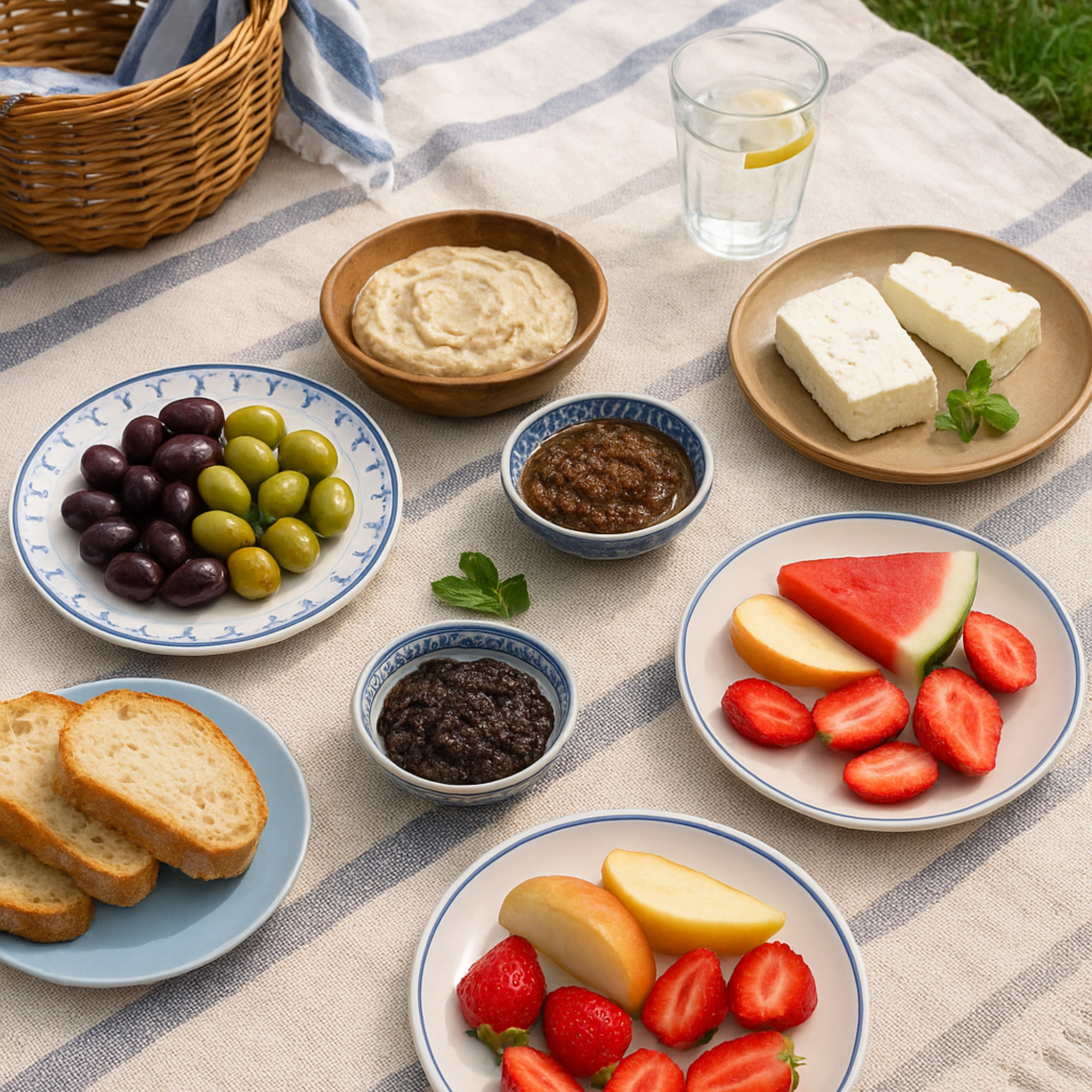 Řecký piknik nemusí být jen o jídle – začíná atmosférou. Rozprostřete deku nebo lehký přehoz v modrobílých barvách, zapalte svíčky a pusťte si jemnou řeckou hudbu. Pokud chcete zážitek ještě umocnit, přidejte keramické mističky, přírodní proutěný košík a talíře v jednoduchém rustikálním stylu. I doma tak vytvoříte autentické „řecké letní pobřeží“.