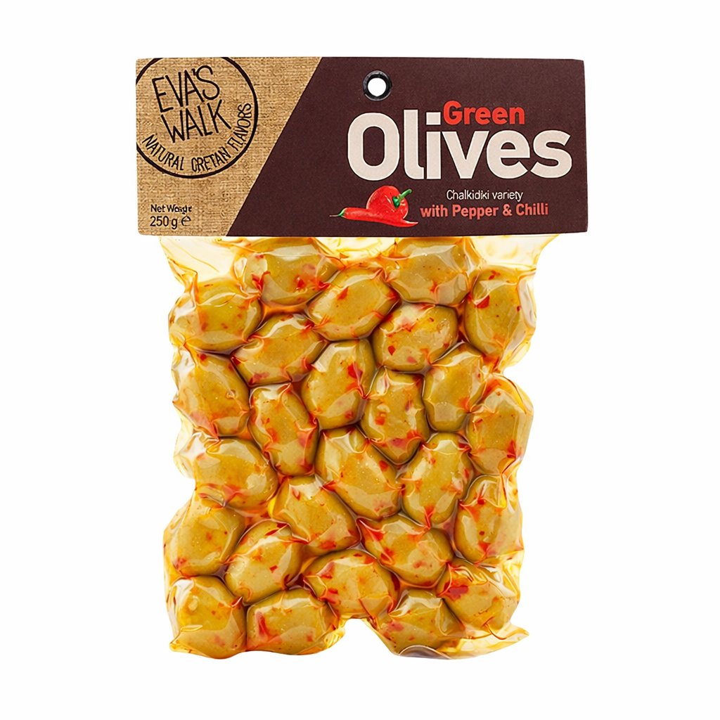 Tyto zelené olivy pocházejí z oblasti Chalkidiki v Řecku, která je proslulá ideálními podmínkami pro pěstování velkých, masitých oliv. Sklízejí se ještě mladé, díky čemuž mají svěží ovocnou vůni, jemně pikantní charakter a lehce nahořklý dozvuk typický pro vysoce kvalitní olivy.