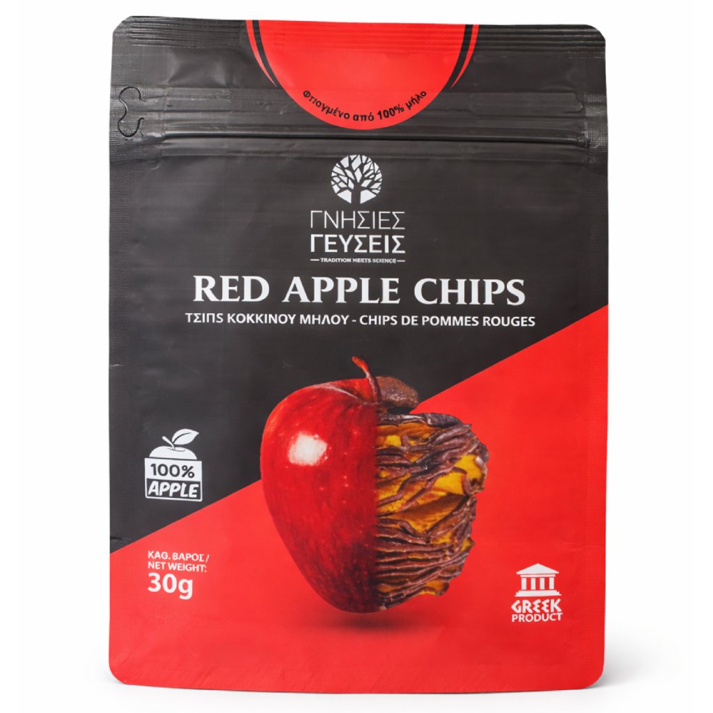 Jsou vyrobeny z šťavnatých červených jablek, která jsou šetrně sušena speciální metodou. Díky tomu si zachovávají přirozenou sladkost ovoce, intenzivní chuť a výjimečně křupavou texturu připomínající klasické chipsy – bez smažení a bez zbytečných přísad.