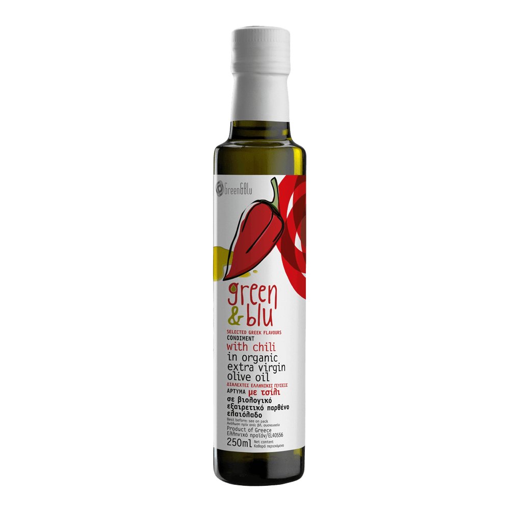 BIO extra panenský olivový olej s chilli od Green&Blu je součástí prémiové řady ochucených olivových olejů, která staví na kvalitních surovinách a čistém složení. Základem je ekologický extra panenský olivový olej, doplněný o přírodní chilli extrakt, který oleji dodává vyváženou a příjemnou pikantnost.