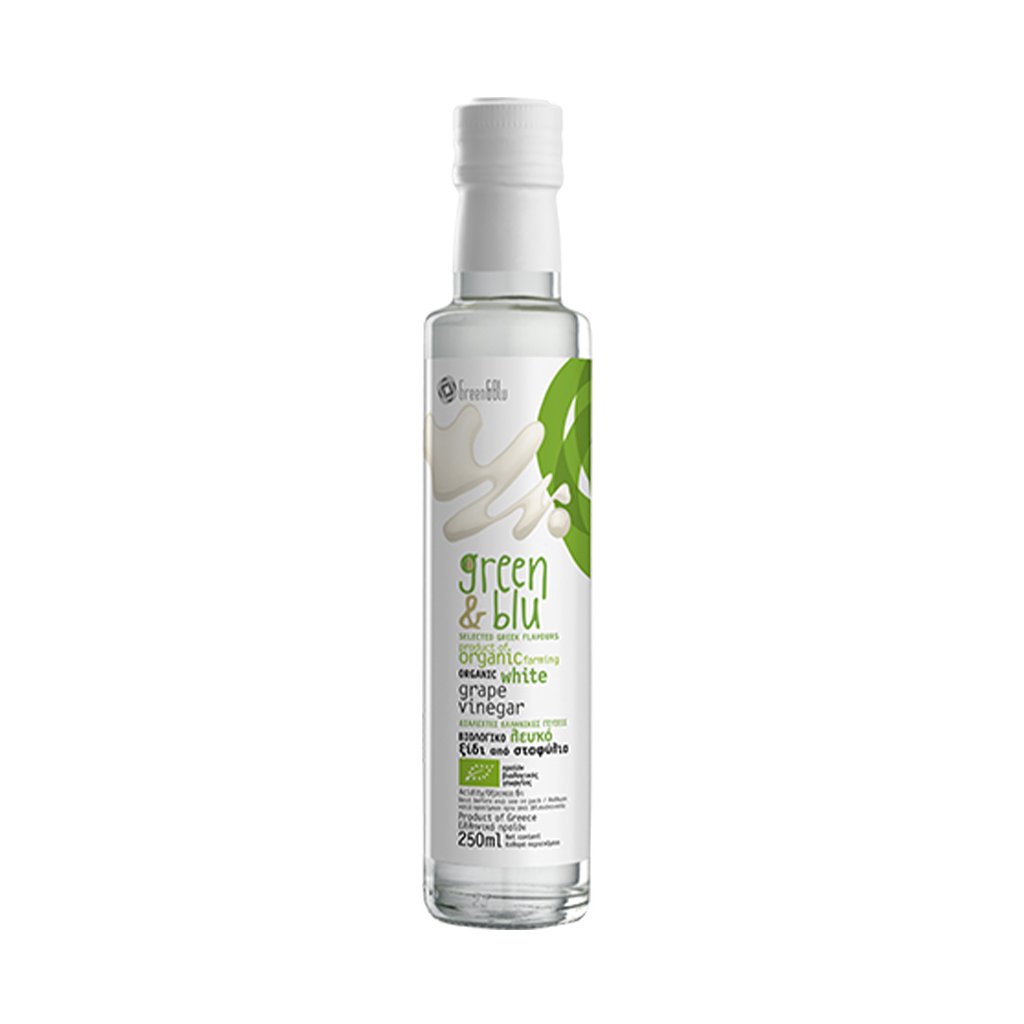 BIO ocet z bílých hroznů od Green&Blu je vyroben z čerstvě lisované hroznové šťávy a hroznového moštu pocházejících z ekologicky pěstovaných bílých hroznů z oblasti Messinia na západním Peloponésu. Hrozny zde dozrávají pod teplým řeckým sluncem, které jim dodává přirozenou plnost a jemnou ovocnou chuť.